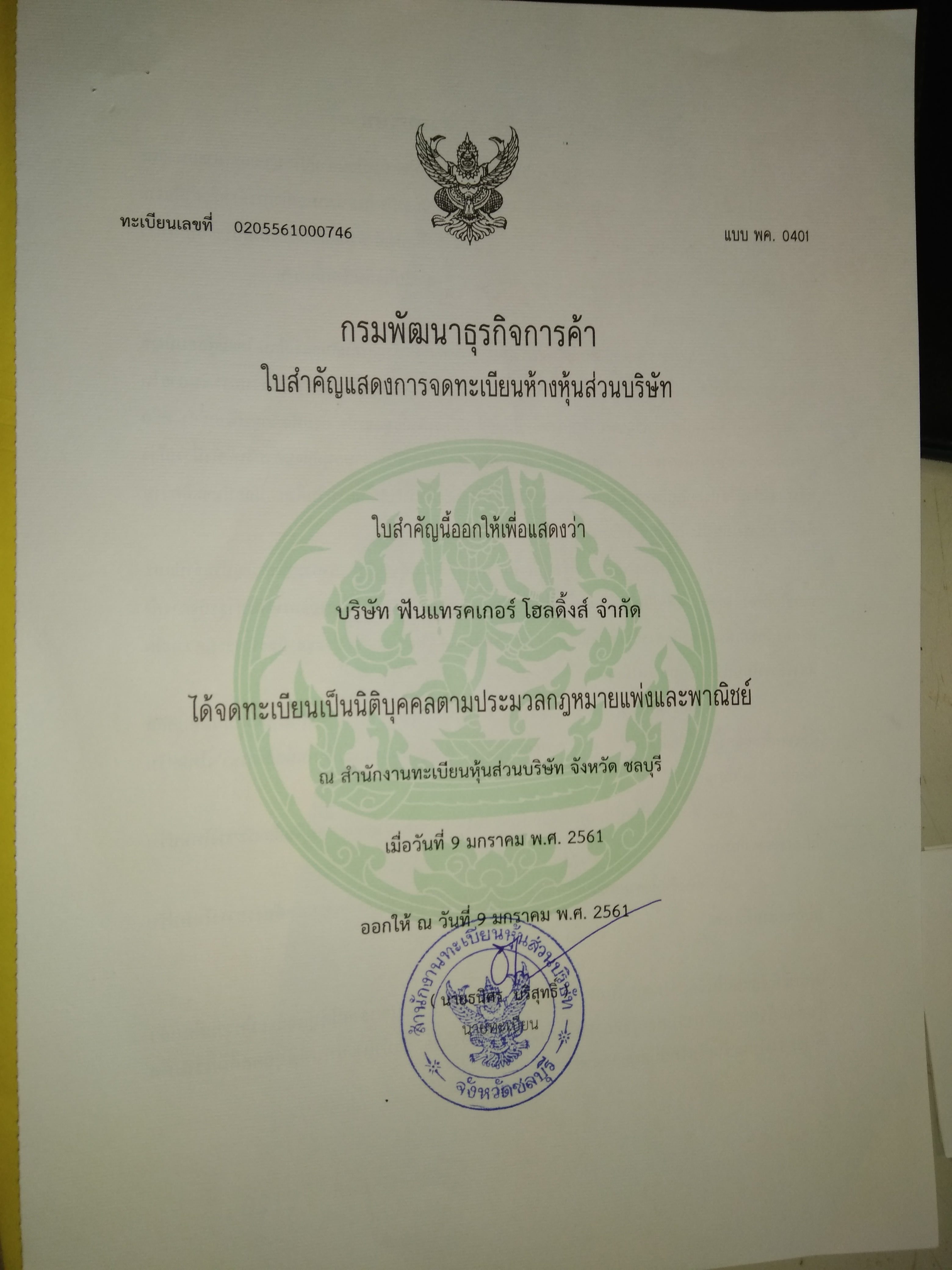 These are copies of our Thailand corporation tax registration number: 0205561000746 docs and permits: